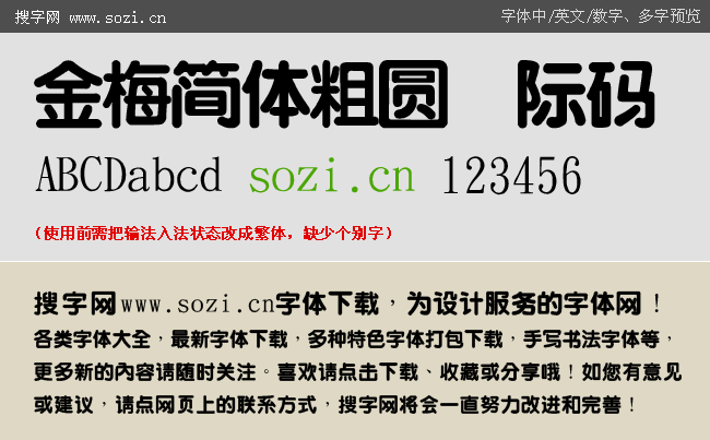 搜字網所有字體源于網絡分享,免費供大家學習交流。除有廠商申明可免費商用以外,都僅限個人非商業使用。未獲字體開發方商用授權的,嚴禁擅自商用,因此造成的侵權責任須自行承擔。本站不承擔任何版權責任和糾紛,本站出于愛好而建,善意免費為各類字體開發者宣傳推廣,您認為有任何不妥之處,請與我們聯系,將會第一時間給您答復!