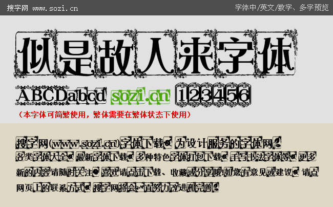 搜字網(wǎng)所有字體源于網(wǎng)絡(luò)分享,免費(fèi)供大家學(xué)習(xí)交流。除有廠商申明可免費(fèi)商用以外,都僅限個(gè)人非商業(yè)使用。未獲字體開發(fā)方商用授權(quán)的,嚴(yán)禁擅自商用,因此造成的侵權(quán)責(zé)任須自行承擔(dān)。本站不承擔(dān)任何版權(quán)責(zé)任和糾紛,本站出于愛好而建,善意免費(fèi)為各類字體開發(fā)者宣傳推廣,您認(rèn)為有任何不妥之處,請(qǐng)與我們聯(lián)系,將會(huì)第一時(shí)間給您答復(fù)!