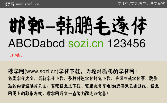 搜字網(wǎng)所有字體源于網(wǎng)絡分享,免費供大家學習交流。除有廠商申明可免費商用以外,都僅限個人非商業(yè)使用。未獲字體開發(fā)方商用授權的,嚴禁擅自商用,因此造成的侵權責任須自行承擔。本站不承擔任何版權責任和糾紛,本站出于愛好而建,善意免費為各類字體開發(fā)者宣傳推廣,您認為有任何不妥之處,請與我們聯(lián)系,將會第一時間給您答復!