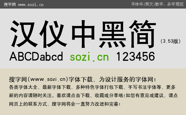 搜字網(wǎng)提供一款漢儀中黑簡中文字體下載,漢儀中黑簡是一款非常端正的黑體字體,字體端正醒目,簡潔大方,適合應(yīng)用于廣告設(shè)計、名片設(shè)計、包裝印刷、兒童產(chǎn)品設(shè)計等應(yīng)用。