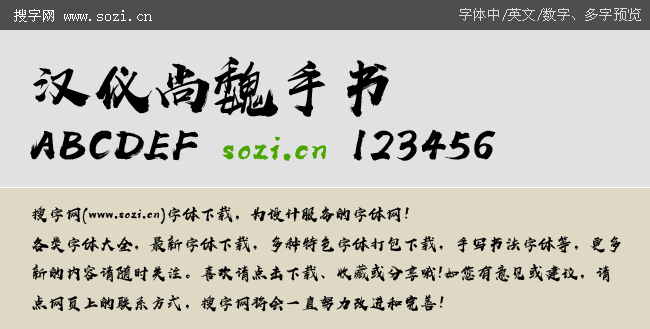搜字網(wǎng)提供一款漢儀尚魏手書中文書法字體下載,漢儀尚魏手書是一款由書法創(chuàng)作人尚巍手寫的書法字體,不管是飛白還是連筆都有著很好的表現(xiàn),邊緣清晰流暢,適合應(yīng)用于廣告設(shè)計、名片設(shè)計、包裝印刷、海報設(shè)計等應(yīng)用。