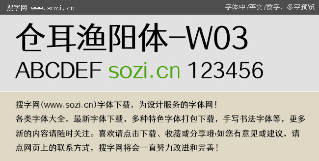 搜字網提供一款站酷倉耳漁陽體-W03中文藝術字體下載,站酷倉耳漁陽體字形結合宋、黑二體的結構特點,將部分筆畫轉折處做圓角處理,方圓結合,厚重又不失靈動。家族字體包含5個字重,均可免費商用。