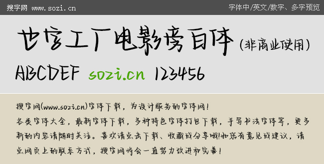 搜字網給大家提供一款也字工廠電影旁白體(非商業使用)中文字體下載,也字工廠電影旁白體是一款手寫書法字體,字體書寫流暢自然,字形瀟灑大方。具有很好的視覺效果。適合應用于藝術設計、平面宣傳設計、網頁設計、海報設計等應用(此字體為個人非商用版,商用可以聯系:官方網址:https://yefont.com/home,聯系方式:13798980448)。