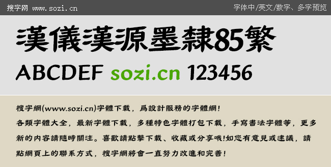 搜字網給大家提供一款漢儀漢源墨隸85繁中文字體下載,漢儀漢源墨隸以現代設計手法重新演繹古老的帛書字體,樸素自然、古雅生動,氣質簡約明快。書體介乎于篆隸之間,扁平取勢,略微向上傾斜,結構緊密,規整之中流露放恣之色。給人以含蘊圓厚之感;細款飄逸靈動,線條輕盈而不失纖韌。適用于畫冊設計、海報設計、包裝設計等場合使用。(本字體為個人非商用版,如需要商用請聯系漢儀公司購買版權)