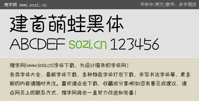 搜字網提供一款建首萌蛙黑體中文字體下載,建首萌蛙黑體是一套卡通風格的POP字體。字體筆畫簡潔醒目,字形為卡通風格,充滿童趣,看上去非常可愛。適合兒童包裝設計、海報設計、廣告設計等應用。