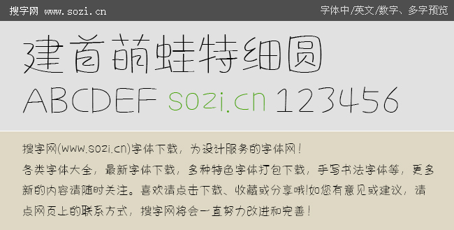 搜字網(wǎng)提供一款建首萌蛙特細(xì)圓中文字體下載,建首萌蛙特細(xì)圓是一套卡通風(fēng)格的POP字體。字體筆畫簡潔醒目,字形為卡通風(fēng)格,充滿童趣,看上去非常可愛。適合兒童包裝設(shè)計、海報設(shè)計、廣告設(shè)計等應(yīng)用。