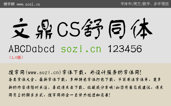搜字網(wǎng)給大家提供一款書法風(fēng)格的文鼎CS舒同體下載。舒同體是被毛澤東主席贊為“紅軍書法家、黨內(nèi)一枝筆”的原中共山東省委第一書記,中國書法家協(xié)會(huì)第一任主席舒同的書法,漢儀舒同體結(jié)體上楷、行、草、篆、隸五體各取一分,風(fēng)格上顏、柳各取一分,何紹基取半分,合稱“七分半”。字體寬博端莊,圓勁婉通,用筆老重,藏頭護(hù)尾,點(diǎn)劃潤厚通暢。此款字體適用于報(bào)紙、刊物、電影、電視等環(huán)境。